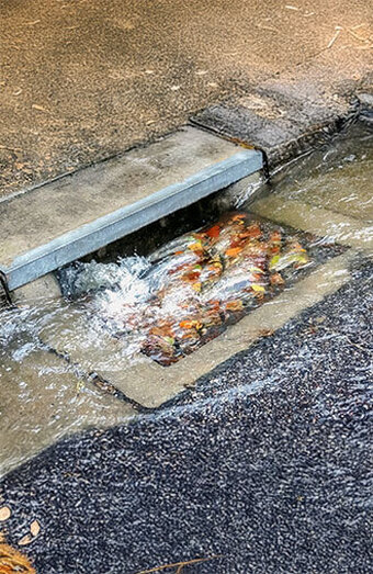 Urgent unblocking of stormwater pits and grated inlets clogged with leaves, sediment, or debris during storms to prevent backflow and surface flooding.